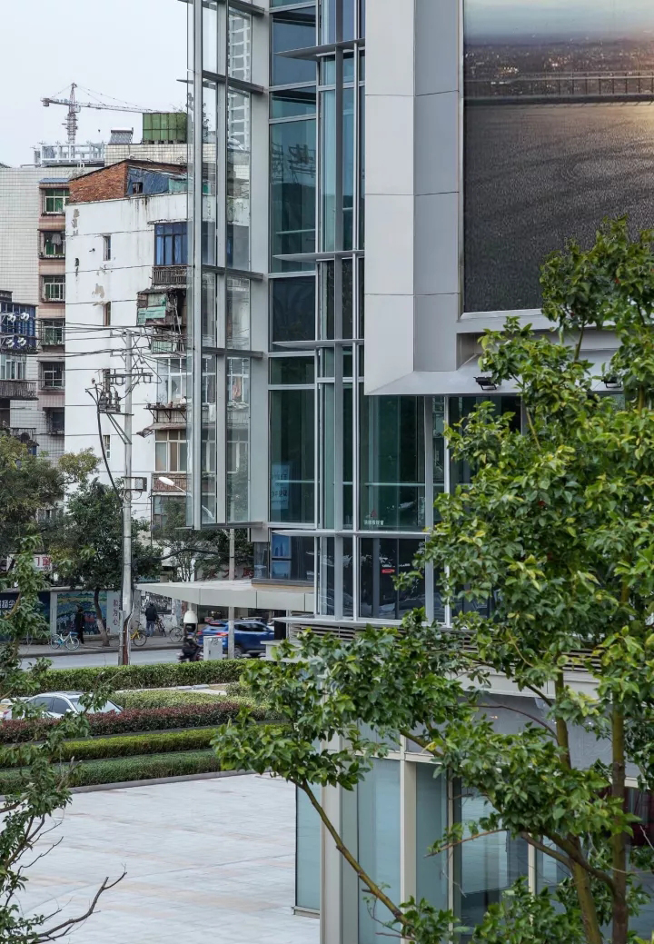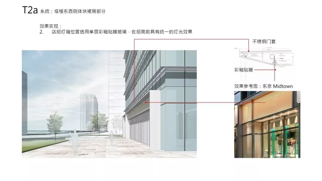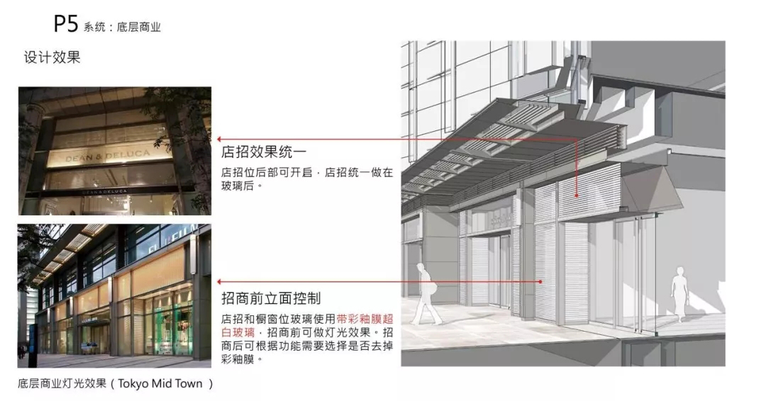 对于首层的商业,一般来说常见做法是招商完成之前用广告布贴上去。我们的目标是招商前和招商后都是一个完整的商业界面同时不能让临时广告布影响品质。设计中采用内外层玻璃的橱窗式做法,在外层玻璃背后贴上不透明膜,在招商前这是一个简洁的灯箱,招商完成后撕掉膜做成橱窗。