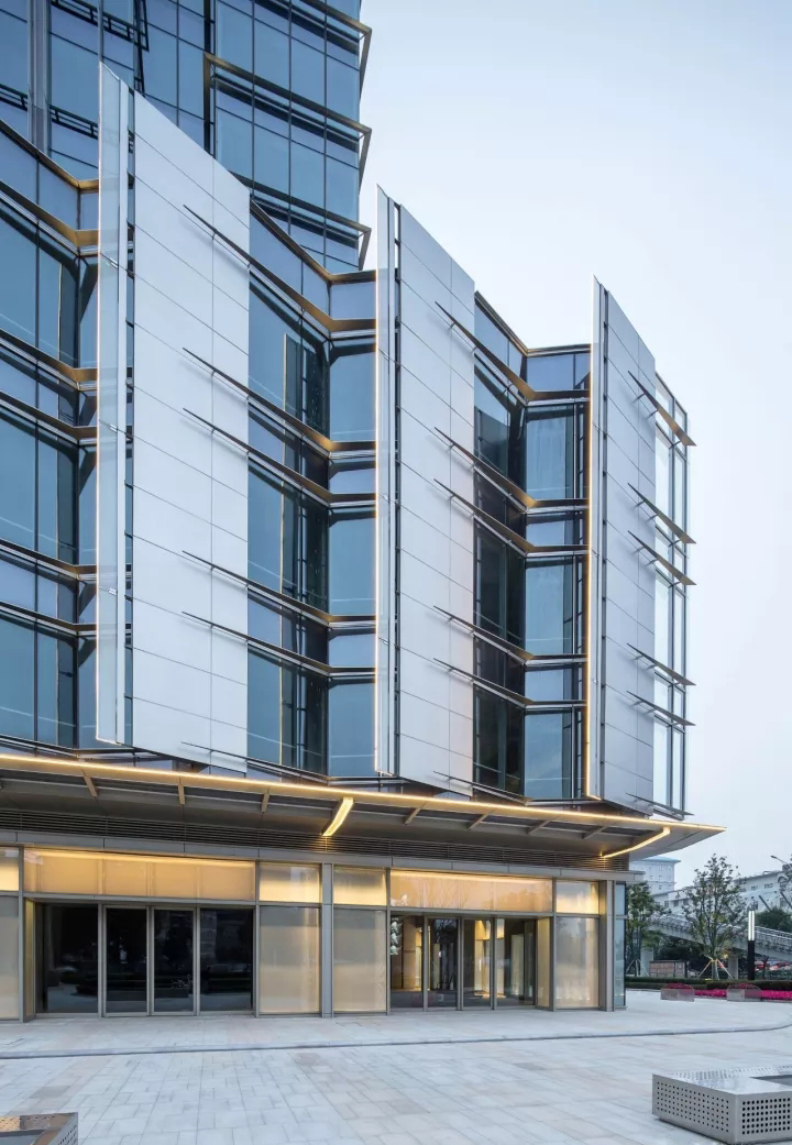 在方案设计的时候就要和灯光幕墙沟通好,建筑师一定要统筹好灯光和幕墙顾问。工作中,灯光和幕墙两个顾问经常会出现各说各话的情况,那建筑师就需要让两个结合到一起,因为幕墙上经常的开槽都是因为灯光的需要,一旦出现不搭配就会在外墙上露出灯具。设计中灯光顾问和幕墙顾问紧密合作,灯具完美的融合入幕墙构件。在整栋大楼外立面看不到一个灯具。比较遗憾的是没有考虑到low-e玻璃的反射,导致构件反射在玻璃上形成“方天画戟”,所以教训是尽量不要用杆件悬空连接横向线条,横向线条最好和玻璃挨着。