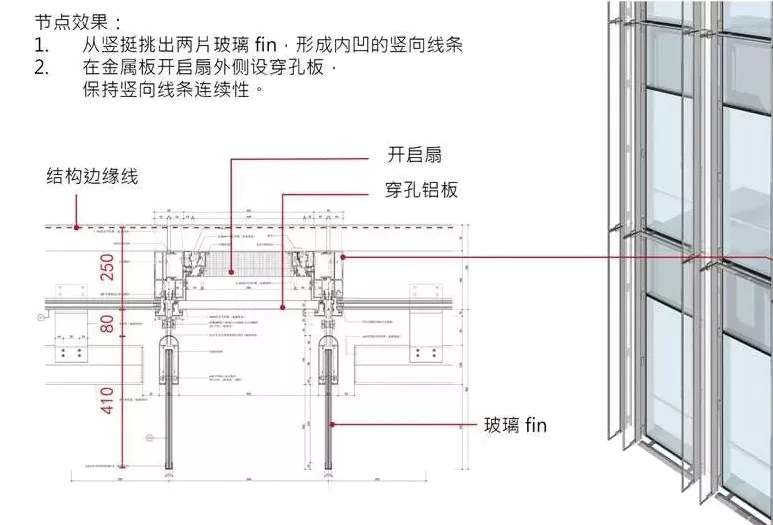 我们综合了两种模式,在平安大厦开启方式的基础上将开启扇往前推,打孔通风板和外墙玻璃平,这样室内使用不受影响,再用竖向的玻璃肋强调出竖向线条。