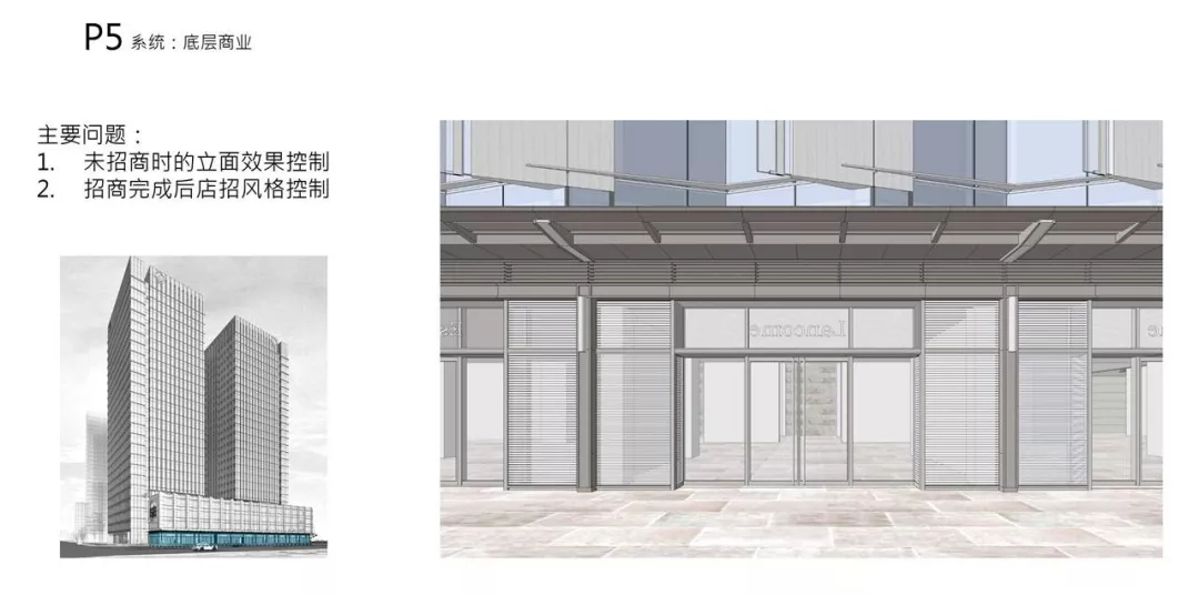 裙房分为沿主干道的商业面和办公出入口面。